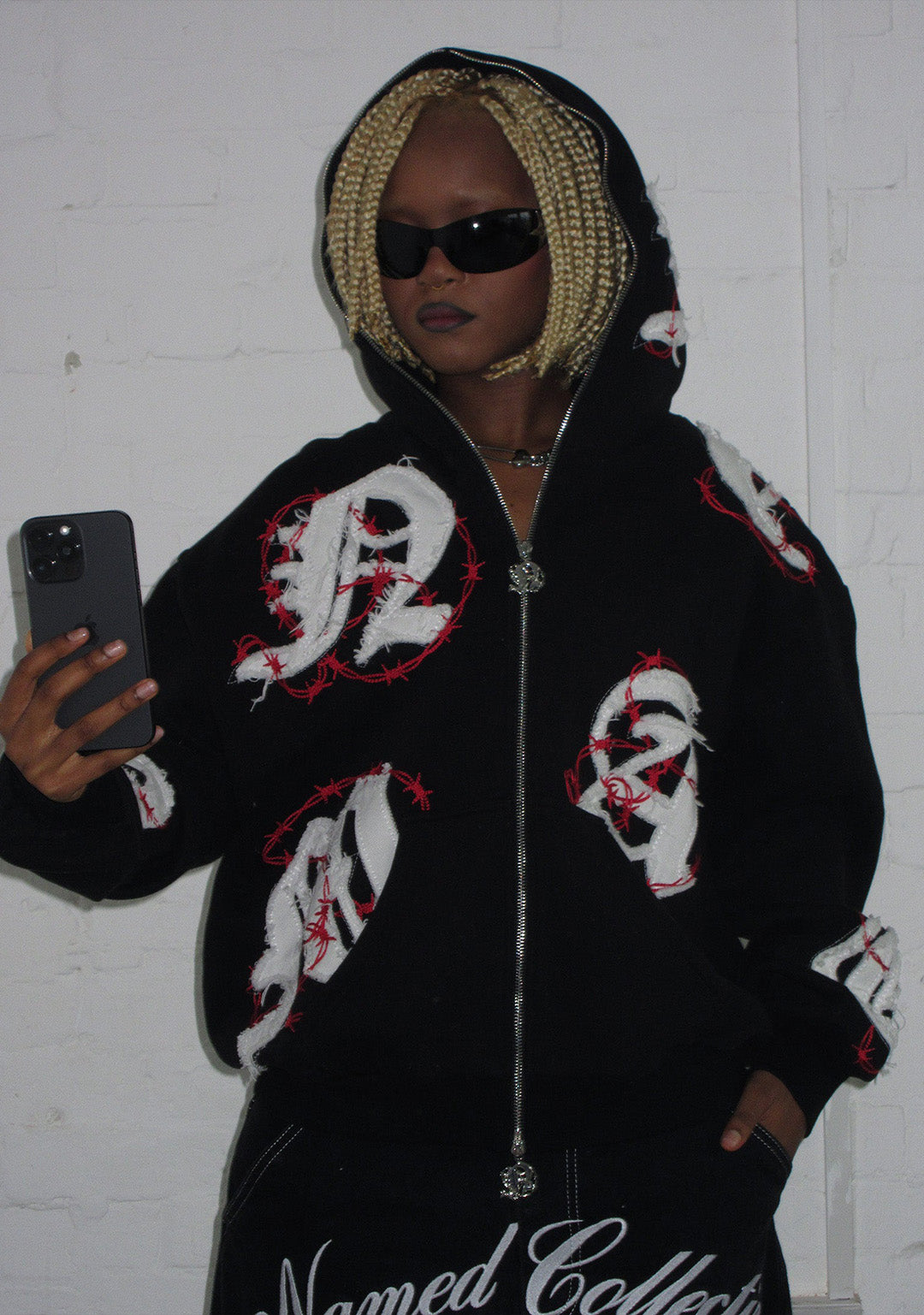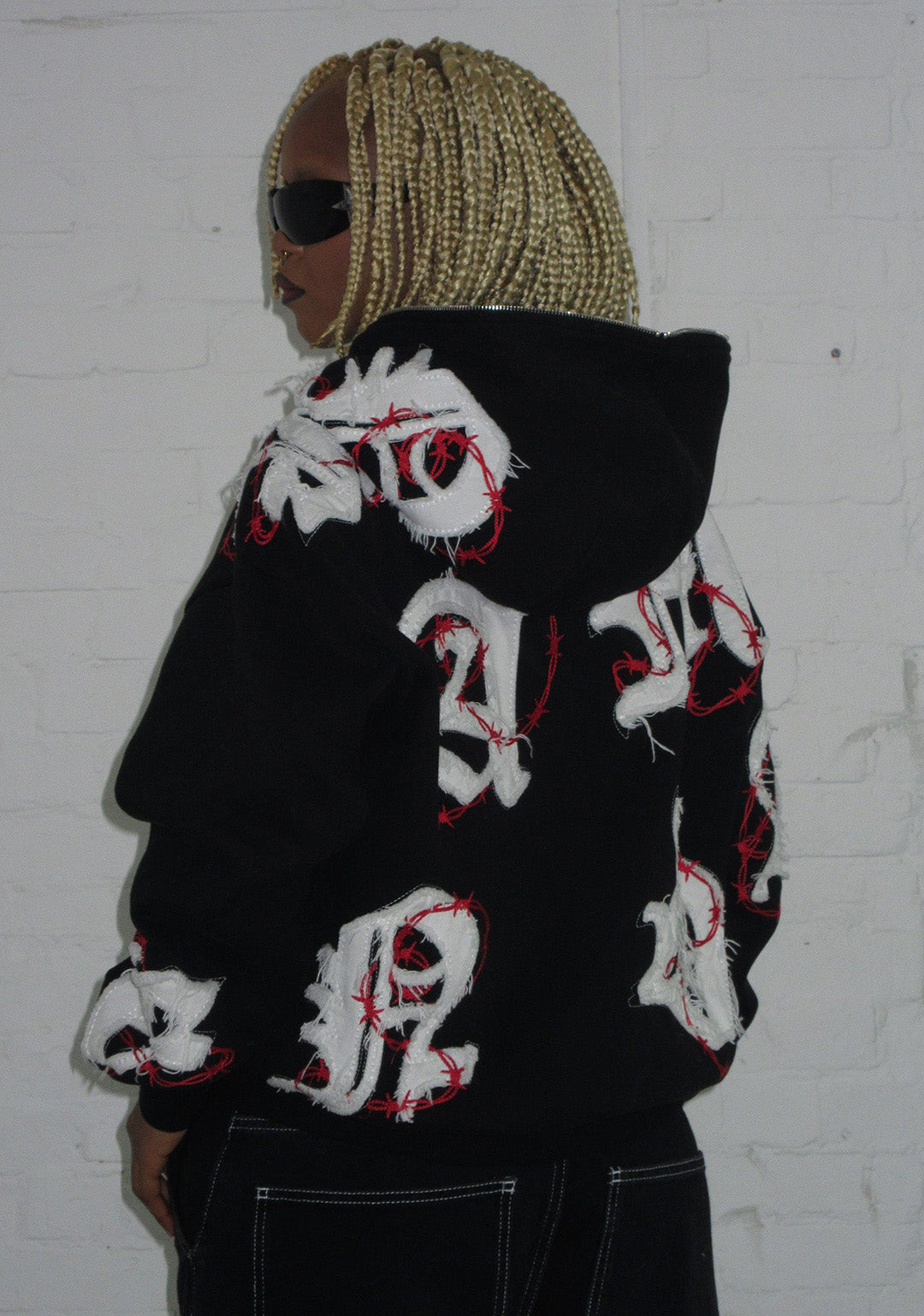 -Raw edge distressed denim old english 'NAMED' lettering patch all over design covering every panel