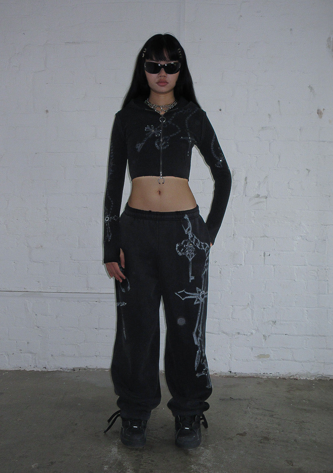 DESTROY SUPER CROP FITTED RIB ZIP HOODIE BLACK VINTAGE WASH