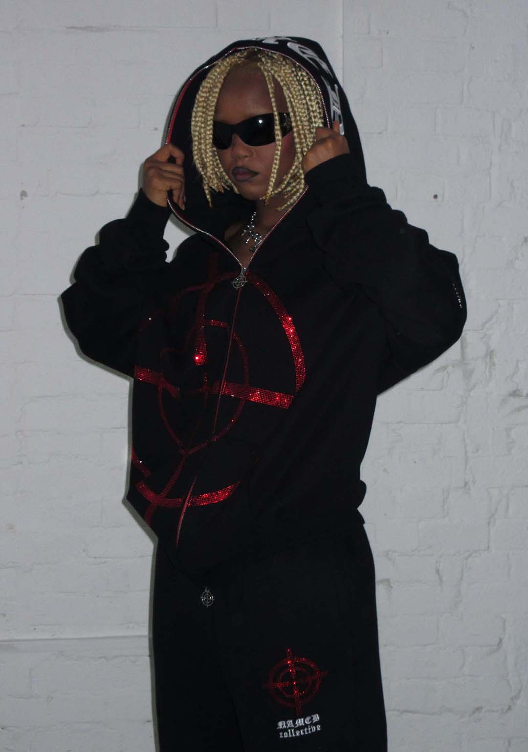 ★ Embellished with red rhinestone target design across chest