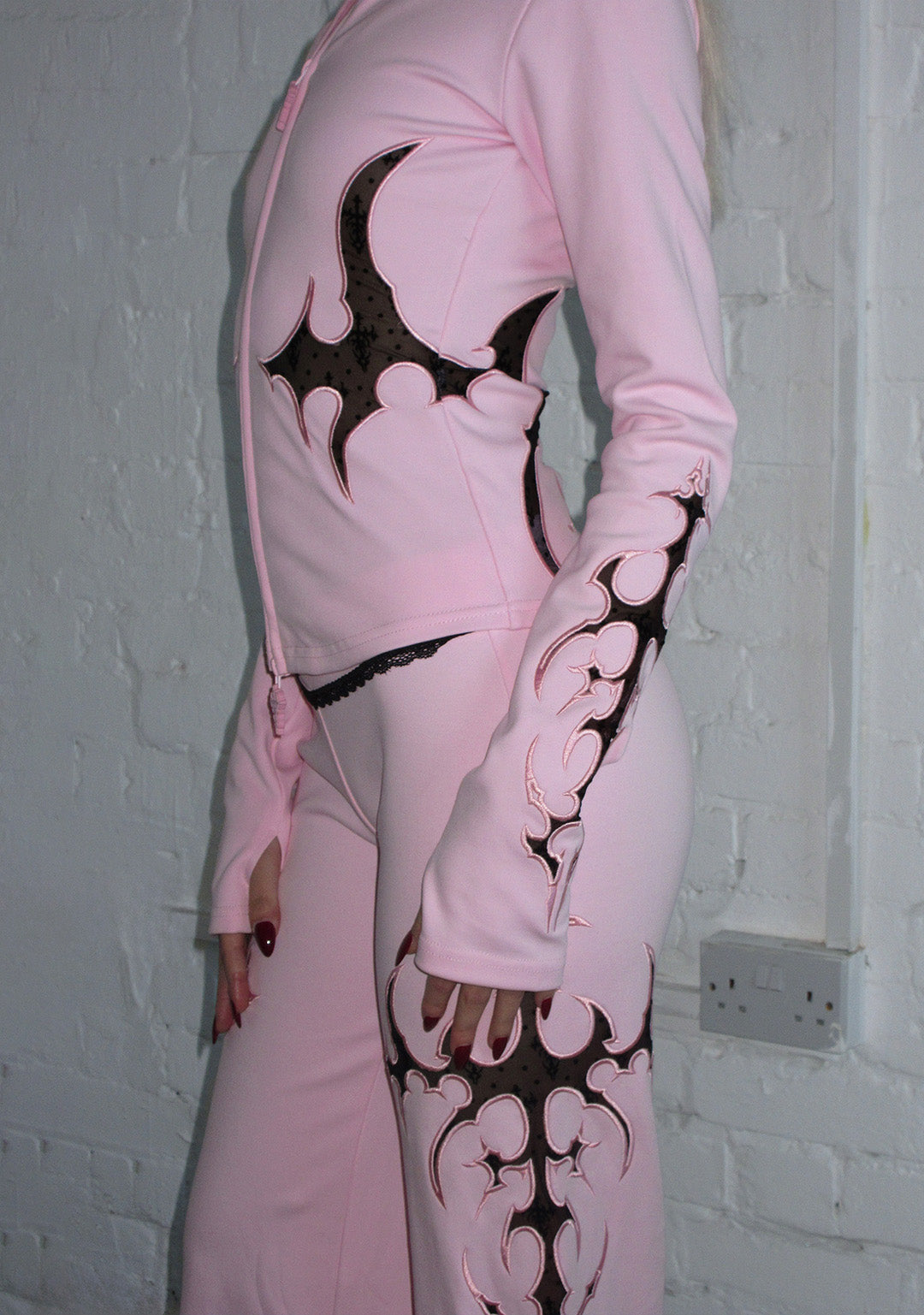 SINNER LACE CUT OUT SCULPT STRETCH ZIP HOODIE BABY PINK